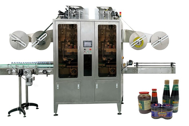 SRL-750 Twin Pack Sleeve Labeling Machine, high-speed automatic system for applying shrink sleeves on dual-bottle packs or multi-can bundles. Perfect for beverage promotions and retail-ready packaging.